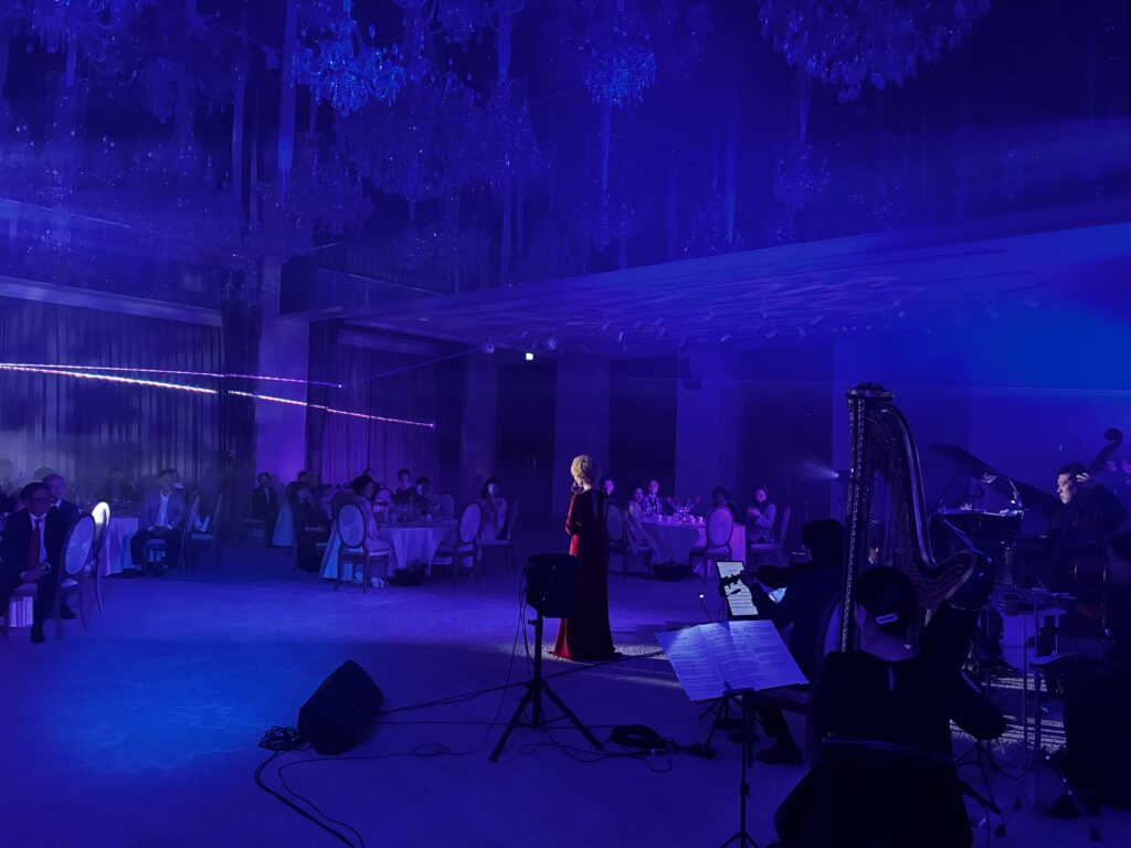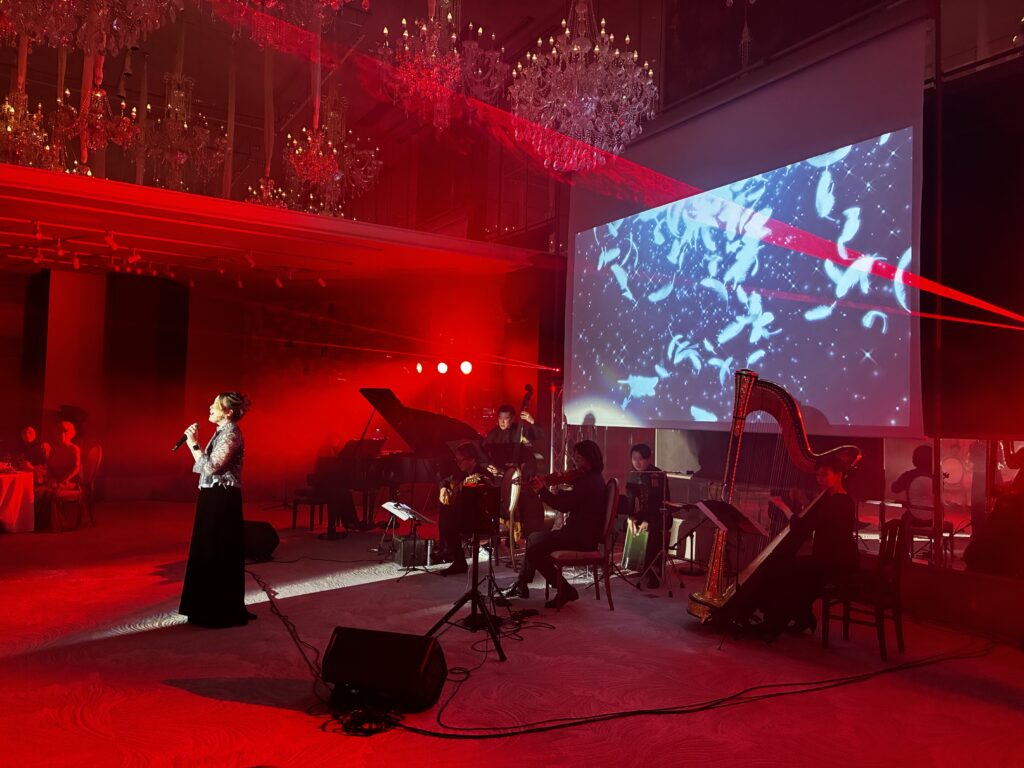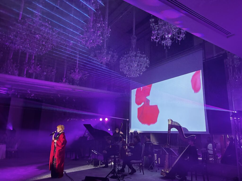 もともと日本舞踊や鼓、笛など和の文化を嗜んでこられた方なのに、この日は真っ赤なドレスで登場して生バンドの演奏で歌やピアノを披露したり、