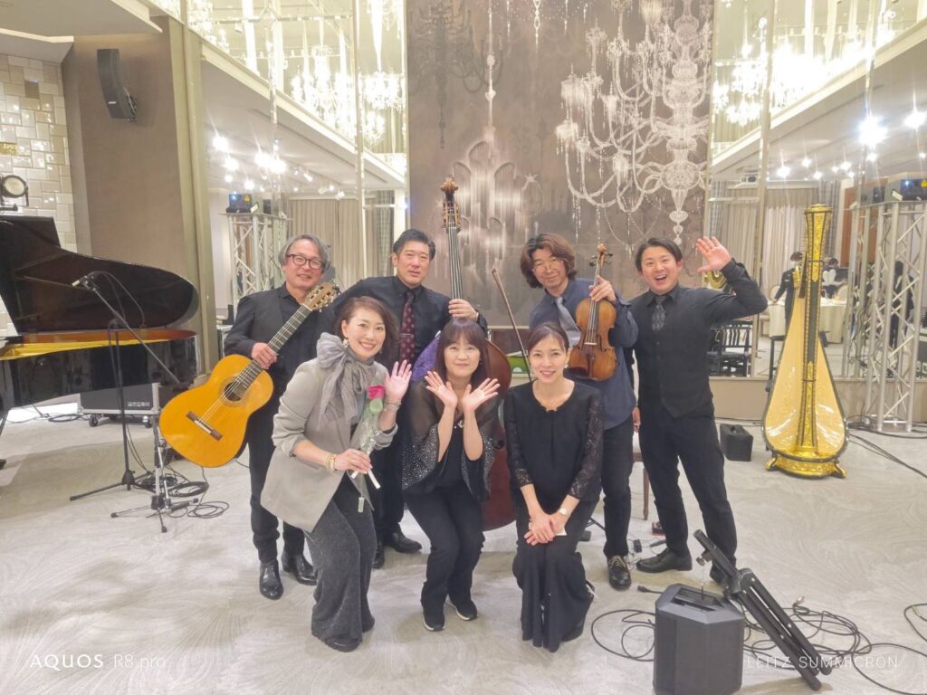最後に生バンドのメンバーさんたちと一緒に。とにかく余興モリモリ盛りだくさんのパーティーがオンタイムでお開きできたこと、神さまに感謝します!ありがとうございました!!